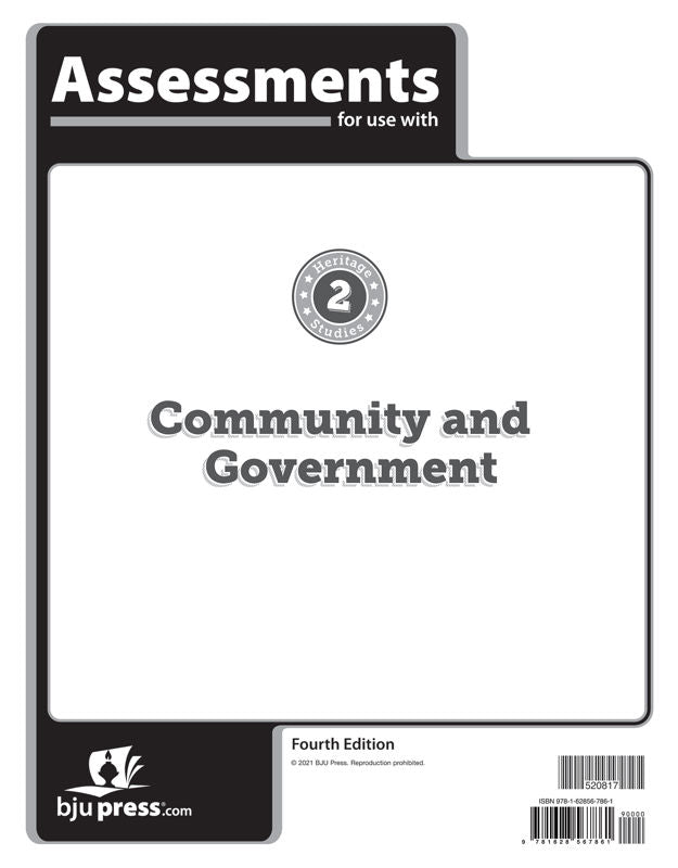 | Book Title | BJU Press Heritage Studies 2, Community and Government, Assessments (Tests), 4th Edition |